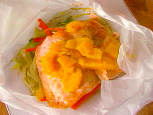 Take a 15 by 36-inch piece of parchment paper and fold in 1/2 like a book. Draw a large 1/2 heart on paper with fold of paper being the center of the heart. Cut out heart and open. Lay fennel, leeks, carrots, and snow peas on parchment in center to 1 side of fold. Mix together salt, pepper, and ground coriander. Sprinkle vegetables with 1/2 of salt, pepper, and coriander. Lay salmon on top of vegetables and season with remaining salt, pepper and coriander. Top with the orange wedges and sprinkle with vermouth. Fold other side of heart over fish and starting at top of heart shape, fold up both edges of parchment, overlapping folds as you move along. Once you reach the end tip, twist several times to secure tightly. Place on microwave safe plate and cook for 4 minutes, on high in microwave, or until fish reaches 131 degrees. Open parchment carefully and serve for a complete meal.