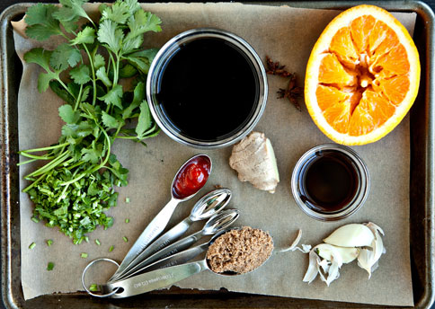 Combine soy sauce, brown sugar, orange juice, Sriracha, pomegranate molasses, star anise pods, ginger, garlic cloves, and chopped cilantro stems.