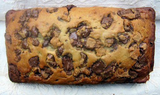 Pour batter into loaf pan. Sprinkle 1/3 cup of chopped peanut butter cups over the top. Bake for 50-60 minutes, or until golden brown and toothpick comes out almost clean in center.
