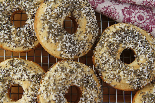 Combine the dry ingredients (flour, xanthan gum, baking powder, yeast, and sugar), and set it aside. Mix together the chia seed gel, water, and grapeseed oil. Add the dry ingredients. Beat on medium-high for 3 minutes. Use slightly damp hands to form the bagels. Sprinkle 1 tsp of chia seeds mixed with salt (if desired) on top of each bagel. Proof for 30 minutes. Bake at 375°F degrees for 12 minutes.