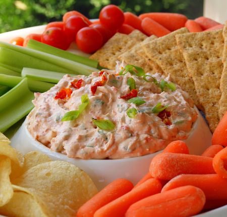 Place the tomatoes, cream cheese, sour cream, mayonnaise, Tabasco sauce, salt and pepper in a food processor fitted with a metal blade. Blitz to blend well. Add the scallions and pulse twice. Cover and refrigerate until ready to serve. Let dip come to room temperature, garnish with sliced scallions if desired, then serve with flat bread, fresh vegetables, crackers, chips or all of the above.