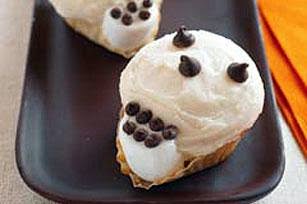 PULL each cupcake liner partially away from cake. Place a marshmallow half between paper and cupcake to create skull's jaw. Frost cupcakes with cream cheese mixture. Decorate with chocolate chips.