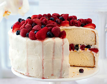 Remove cake from refrigerator 1 hour before serving. Hull and cut remaining strawberries lengthwise into 1/2-inch-thick wedges. Sprinkle sliced strawberries and remaining raspberries and blueberries over cake.
