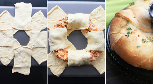 Open the tubes of crescent rolls and separate each roll into four rectangles. Lay the rectangles on a parchment lined or nonstick baking sheet to form a large circle.