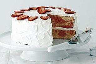 MIX sour cream and powdered sugar in medium bowl until well blended. Gently stir in whipped topping. Place one of the cake layers on serving plate; spread top with 1 cup of the whipped topping mixture. Top with 1 cup of the strawberries and remaining cake layer. Spread top and side of cake with remaining whipped topping mixture. Top with remaining 1/2 cup strawberries just before serving. Store any leftover cake in refrigerator.