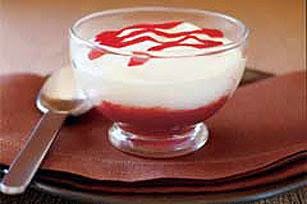 POUR half of the raspberry sauce into dessert dishes. Top with mousse. Spoon remaining raspberry sauce over top.