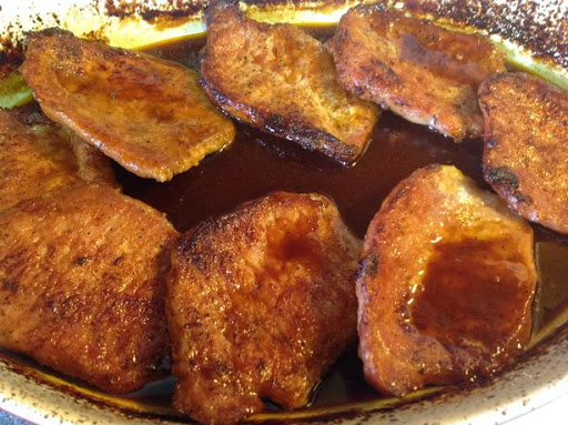 1 Brown chops on both sides. 2 Place in greased casserole dish. 3 Mix all remaining ingredients and pour over pork chops. 4 Bake, covered, at 350 for one hour. Or simmer in skillet covered for 20 to 30 minute until done. DOUBLE the SAUCE you will love it!!