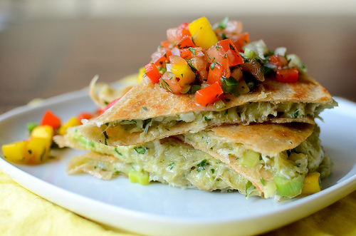 To cook, heat a little oil in a nonstick sauté pan over medium heat and cook the quesadillas in batches until lightly browned and the cheese is melting, about 2 minutes per side.