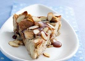 2. In large bowl, mix all ingredients except bread, almonds and caramel topping with wire whisk until smooth. Fold in bread. Pour into quiche dish; sprinkle with almonds.