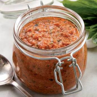 2 In the bowl of a good processor, combine the almonds with the tomatoes, 1 clove garlic, 1 tablespoon paprika, 1 tablespoon balsamic vinegar, 2 teaspoons lemon juice, 1/2 teaspoon salt, pepper and 1/2 teaspoon red pepper flakes. Process until the nuts are finely ground.
