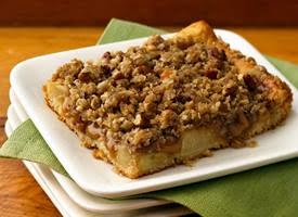 3. In medium bowl, mix brown sugar, flour, oats and cinnamon. With pastry blender, cut in butter, until mixture looks like fine crumbs. Stir in pecans. Sprinkle evenly over apples.