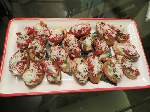 Assemble: On the toasted bread season the tomato mixture with salt and pepper and then the basil. Spread some ricotta mixture over each crostini. Top with the tomato/onion mixture and sprinkle with shredded cheese on each slice. Transfer to a serving plate.