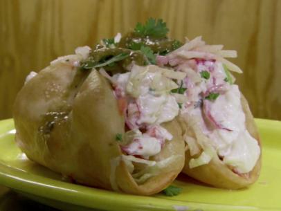 To build the dish, fill a taco shell with 2 to 3 tablespoons jicama slaw, and then top with 2 tablespoons lobster sauce, some lettuce and tomatoes. Finish with a dollop of salsa verde. Repeat the process and serve.