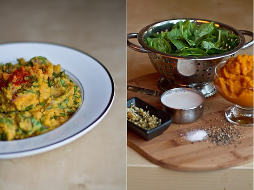 Directions: Bring a large pot of water to a boil over high heat and boil potatoes for 18 to 22 minutes or until fork tender. Drain and place in a very large bowl. Meanwhile, heat olive oil over low heat in a skillet and sauté garlic for about 1 minute. be careful not to burn it like I did! Drain and mash potato chunks in the large bowl with a fork. Mix in pumpkin puree, spinach, almond milk, Earth Balance/butter, black pepper, and salt. Makes 5-7 servings.