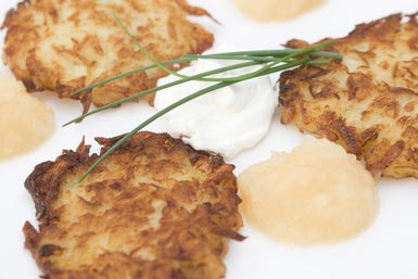 Drop tablespoonfuls of potato mixture into skillet and spread out to a 3-inch circle, about 1/4-inch thick. Fry until brown on the bottom (don't turn until the pancake is brown or it will stick), about 3 to 5 minutes, reducing the heat to medium, if needed, to prevent burning.