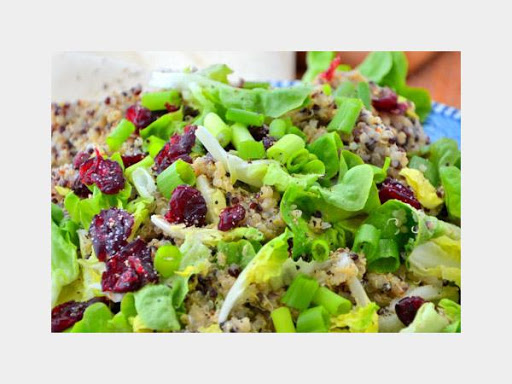 In a large serving bowl, COMBINE cooked quinoa, dried cranberries, scallions and mixed greens; gently toss with Caesar dressing to coat. Serve chilled.