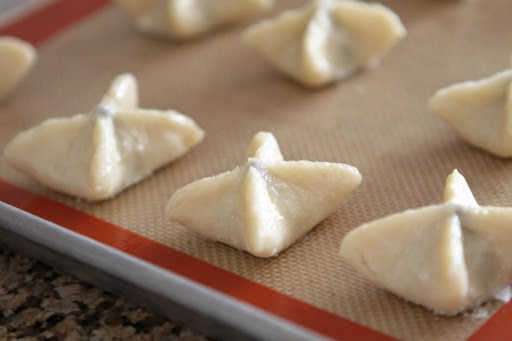1. Preheat oven to 350 degrees F. Roll out pie dough onto a lightly floured counter top. Place 10 kisses around the edges of pie dough, about 2 1/2 inches apart (as in the photo above). Take a knive and cut a 2 1/2-3 inch circle around kiss. Fold half of pie dough around top of dough and pinch edge around top of kiss. (See Photo, step 1). Now, fold up both sides of remaining dough up to the tip of the kiss pinching edge. (See Photo, step 2). Now press together edges and form criss cross as shown in photo, step 3. * *Continue cutting dough around kisses until all dough is used up. I got about 14 rounds cut when I re-rolled my scraps :) **