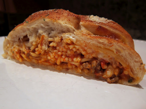 Remove wrap from dough. Place spaghetti lengthwise in a 4-inch strip down the center of dough. Tip with sauce and cheese cubes. (I mixed my spaghetti and sauce together and added a ½ pound of cooked Italian Sausage)