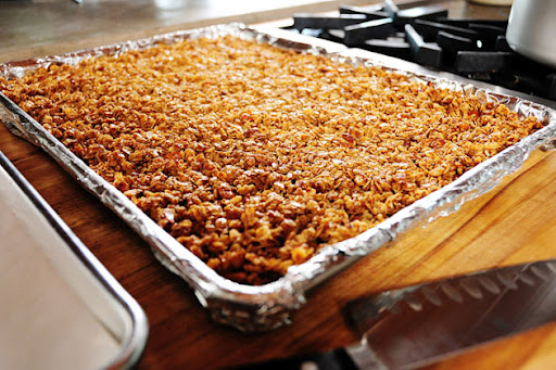 Toss together the toasted oats, rice cereal, wheat germ, pecans and almonds. Pour in the sugar mixture, stirring as you pour. Toss to combine; it will be sticky.