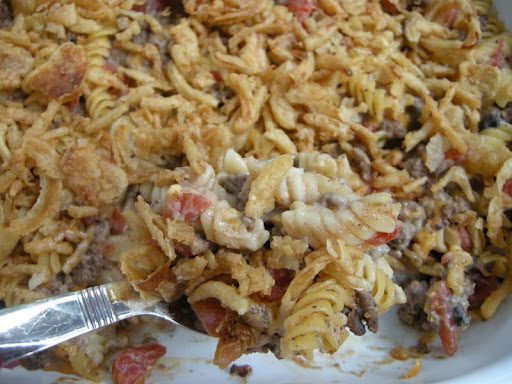 Cook pasta as directed, rinse and drain. Brown beef, drain fat. Combine all ingredients except french fried onions. Pour into greased 2 quart casserole. Cover and bake at 350 for thirty minutes. Uncover, top with french fried onions, and bake five minutes longer.