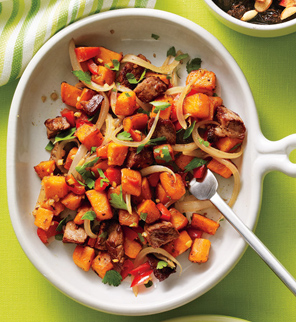 In a medium skillet over medium-high heat, sauté 3 oz diced beef top sirloin in 1 tsp olive oil, turning occasionally, until browned, 5 minutes. Season with salt and pepper and set aside. Sauté 1/2 sweet potato, diced, and 1/4 cup each chopped onion and chopped red bell pepper in 1 tsp oil until vegetables soften, 5 minutes. Add steak, 3 tbsp water, 1 tsp minced garlic and 1/4 tsp ground cumin; stir to combine. Cover and cook until sweet potato is tender, adding water if necessary, 5 minutes. Top with chopped parsley.