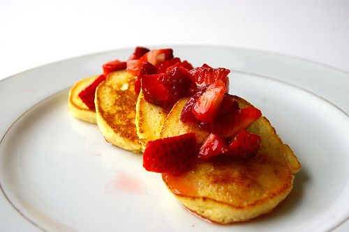Heat a frying pan to medium-high. Melt enough coconut oil for your first batch of pancakes. Pour batter into pan to make pancakes about 3 inches wide. Once bubbles form, flip gently and cook for 2-3 more minutes. Repeat with remaining batter and serve. Top with strawberries and maple syrup, if desired.
