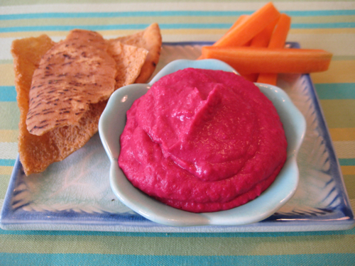 I made this for a snack today for me and my two young girls. They were squealing with delight as the food processor turned all the ingredients into a fantastic pink color! But trying a bite…. hold the phone! Not so fast Mom! They did end of trying a bite, but didn’t eat more. boo… I adored this hummus and will make it again. It’s also one of my favorite colors.