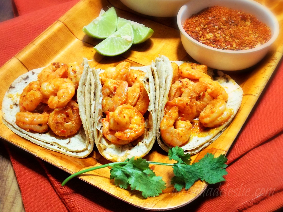 For each taco, spoon a couple of tablespoons of the spicy tequila lime shrimps onto two warm corn tortillas stacked on top of each other. Garnish with shredded cabbage, Pico de Gallo, and a squeeze of fresh lime juice. If you like it extra spicy, sprinkle some more red pepper flakes on top. Enjoy!!!