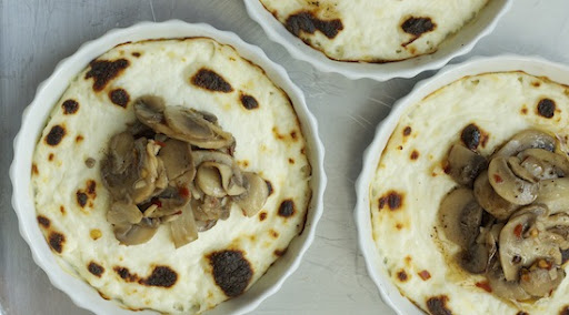 4. To finish: Place the oven rack in the top of the oven and preheat the broiler to high. Divide the strained ricotta between four shallow ramekins, slightly mounding the ricotta in the middle of each dish. Place the ramekins on a rimmed baking sheet and place under the broiler. Cook, rotating the baking sheet halfway through cooking, until the ricotta is browned on top and heated all the way through, 5 to 7 minutes. Sprinkle with salt and pepper and top with the mushrooms. Drizzle with a little balsamic brown butter (store the rest in an airtight container for up to 1 week). Serve the baked ricotta warm with bread.
