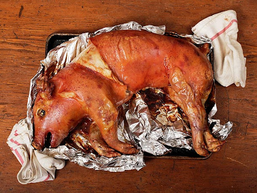 Increase oven temperature to 500°F and cook until skin is crisp all over, about 30 minutes longer. Remove pig from oven, tent with foil, and allow to rest for 30 minutes. Serve by tearing skin into serving-sized pieces and removing flesh with your fingers and piling it onto a serving platter.