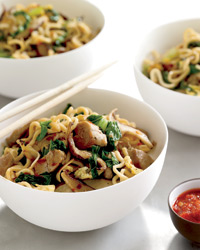 > Cook the noodles according to the package directions, then drain and rinse under cold water. In a measuring cup, mix the stock with the soy sauce, Shaoxing, sesame oil and crushed red pepper. In a small bowl, mix the cornstarch with the water.