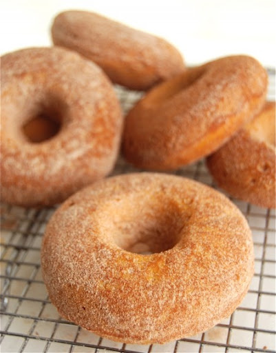 While the doughnuts are still warm (but no longer fragile), gently shake them in a bag with cinnamon-sugar. Or better yet, pumpkin-spice sugar, made by combining the aforementioned pumpkin pie spice (or substitute) with granulated or extra-fine sugar.