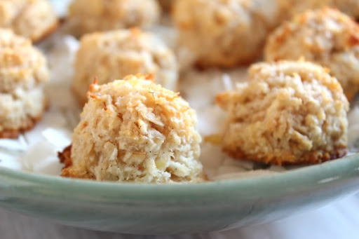 Using a mini ice cream scoop or a small spoon, scoop the dough onto the prepared baking sheet (no need to leave much room in between as they do not spread out). Bake for about 20-25 minutes, or until the bottoms of the macaroons are lightly browned. The macaroons will be very soft at this point.
