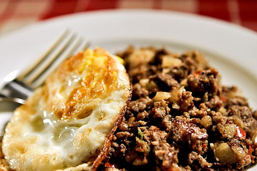 Pour the drippings from cooking a roast into a measuring cup and let the fat rise to the surface. Skim off the fat, reserving 4 tablespoons in a saucepan and discarding the rest. (If the fat measures less than 4 tablespoons, add enough butter to make up the difference.) Measure the defatted pan juices; if you have less than 2 cups, add water to make 2 cups. Boil the pan juices, the 2 cups water, and the onion until the onion is clear. Add the beef and return to a boil. Remove from the heat and stir in the evaporated milk. Serve over rice, grits, or cornbread.