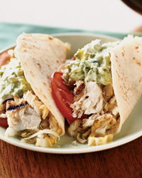 Fish tacos are a staple among California surfers but are often beer-battered and fried. Kerry Simon's healthier, grilled version enriches the guacamole with low-fat sour cream.