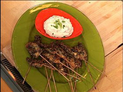Place the minced onion, garlic flakes, poppy seeds, sesame seeds, black pepper and coarse salt on a plate and mix it all together. Drizzle the chicken tenders with some EVOO, giving them a toss to make sure they are fully coated. Place skewers through each chicken tender lengthwise. Dip each skewered piece of chicken into the seed mixture and turn to coat.
