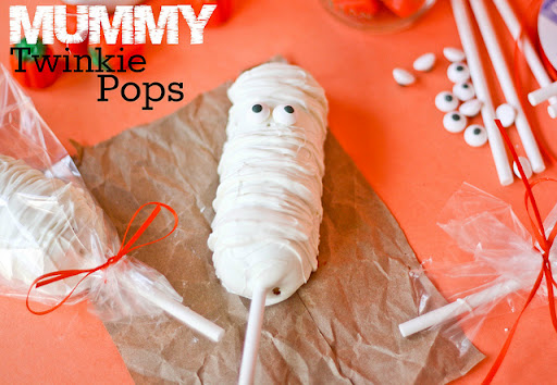 3. Using a fork, drizzle melted candy on the Twinkies by using a back and forth motion. Place eyes on the top 1/3 of the Twinkies. Place back on baking sheet in the freezer until set. Wrap and tie with ribbon.