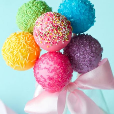 Cake baked, crumbled, mixed with frosting, rolled into balls, frozen, and stuck on lollipop sticks before being dipped in candy coating. Super fun recipe!