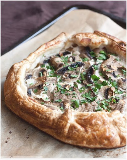 5. To make small tarts or hand-pies (whichever you want to cal them), cut out rounds of puff pastry with a cookie cutter, place a small amount of cheese mixture in the middle and top with a slice of mushroom. Lay another round of pastry on top, pinch the sides together and cut air holes into the top.