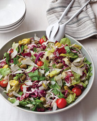 Part green salad, part antipasto salad, this recipe combines lettuce, celery, onion, peperoncini, olives and cherry tomatoes—all tossed in a dressing made with olive oil, vinegar and a little mayonnaise. "The salad reminds me of one my mother made," says Fran Parisi. "Her dressing had no mayo, of course—it was strictly oil and vinegar."