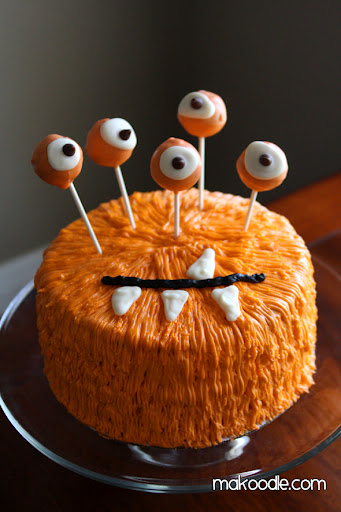 3.Once the orange dried, I used a Wilton candy squeeze bottle to create the white eyeball shape on the cake pop using white candy melts.