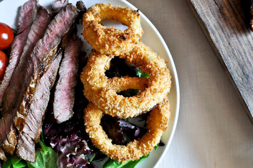 When ready to cook, preheat grill or grill pan. Grill steak about 6 minutes on each side for it to be medium/medium well. Remove from grill and let sit for 10 minutes. Slice against the grain to ensure tenderness. Serve with onion rings!