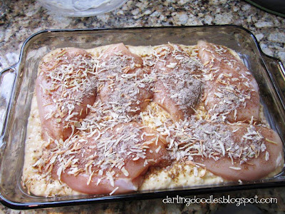 Lay chicken breasts on top of rice mixture and sprinkle onion soup mix on top. Cover with tin foil. Don’t forget that important step!