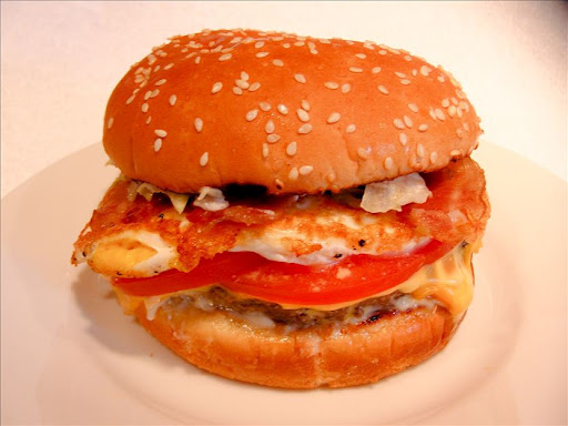 Menu Description: "This is the aristocrat of all burgers because we crown it with a fresh fried egg. In addition, topped with three strips of hickory-smoked bacon, American cheese, crisp lettuce, tomatoes and mayo."