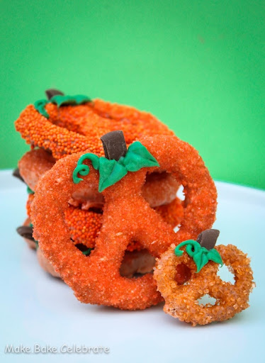 I didn't take step by steps photos since I have done pretzels so many times here before. These little guys can be made using the same process as the apples with just a few changes. Instead of using the rips this time I piped on the leaves with green candy melts and I also covered the the pretzels in sprinkles. I used orange wilton candy melts for these and once covered they were more of a peach so the sprinkles gave them the pumpkin orange I was looking for. You can find more tricks and tips on how to cover pretzels here and the apple pretzel post here.