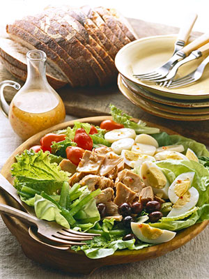 1. On large platter, arrange lettuce, separated into leaves, tomatoes, sliced sweet green peppers, sliced potatoes, eggs, and tuna. Top with olives. Drizzle with dressing. Makes 6 servings.