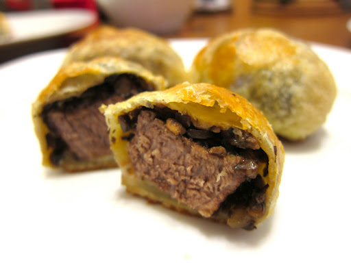 On a work surface, roll 1 sheet of puff pastry to a 10 by 14-inch rectangle. Put teaspoon-sized mounds of mushroom mixture on the pastry, evenly spacing them in 4 rows of 3. Top the mushroom mound with a piece of beef, seared side up. With a sharp knife, cut the pastry into even squares around the meat and mushrooms. Working 1 at a time, pull 2 opposite sides of pastry up over each beef piece, then fold the ends over the top to make a packet. Invert and arrange the packets seam side down on the baking sheet and press them lightly to seal the pastry. Repeat with the remaining beef, mushrooms, and pastry.