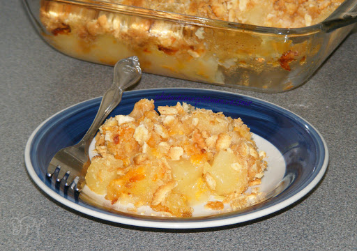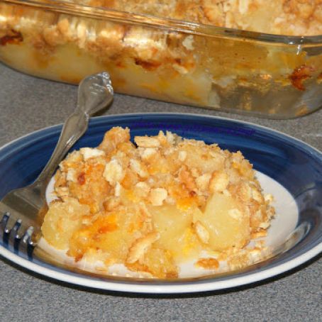 Meanwhile, in a mixing bowl, stir together the sugar and flour. Stir in the cheese and well-drained pineapple. Pour the mixture into the prepared dish. Top with the buttered crackers.