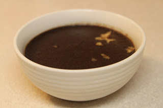 Heat your oven to 350 degrees. On the stove heat the chocolate chips and the half & half, stirring constantly until the chips are melted and the mixture is smooth. Take off the burner to cool while you set up your custard cups. Set your custard cups in a baking dish. The dish needs to be deep because you will be adding water to it.