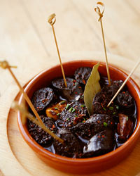 Jim German and his wife, Claire Johnston, make wonderfully simple snacks to accompany his cocktails. A favorite at their restaurant, Jimgermanbar, is this smoky Spanish sausage with garlic, cooked gently in red wine until it's plump and juicy